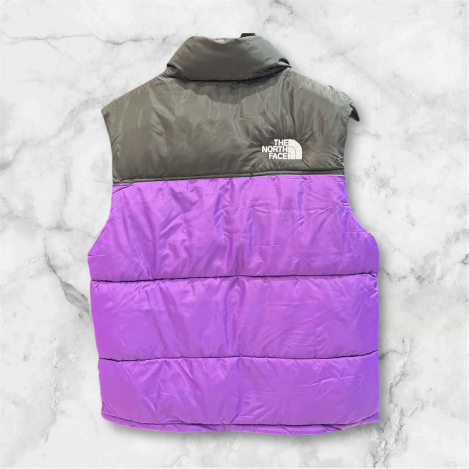 Αμάνικο μπουφάν puffer της εταιρίας The North Face σε μωβ χρώμα. Ελαφρύ, ιδανικό για άνδρες και γυναίκες.